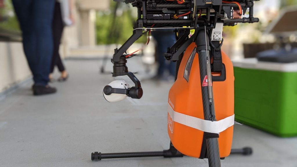 MATRICE600PROは、最大積載重量(ドローンに搭載できる荷物の重量)が6kgなので、今回のAED輸送に最適だと判断しました。