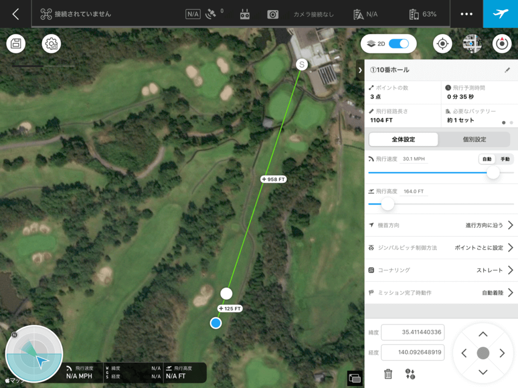 上記の画像では、ウェイポイント(空中上のドローンの通過点)を3点置き、3つ目のウェイポイントに到着したら、自動航行のミッションが完了となります。