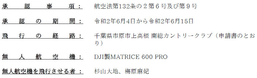 今回のゴルフ場での輸送実験で、一番遠い着陸場所が1.5kmほど離れた場所であったため、操縦者から見える範囲ではなかったので、目視外飛行の申請が必要でした。